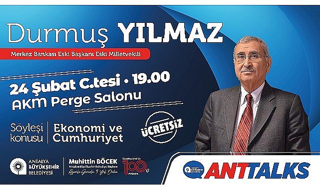 Antalya Büyükşehir Belediyesi tarafından düzenlenen Anttalks etkinliği kapsamında Merkez Bankası Eski Başkanı Durmuş Yılmaz, 24 Şubat Cumartesi günü 19.00’da AKM’de Antalyalılarla buluşacak.Antalya Büyükşehir Belediyesi’nin paylaşmaya değer fikirleri, yaşamları ve deneyimleri, başta gençler olmak üzere Antalyalılarla paylaşmak için geçtiğimiz yıl başlattığı Anttalks söyleşileri, ‘Ekonomi ve Cumhuriyet’ konulu söyleşi etkinliğiyle devam ediyor. Anttalks; ‘Ekonomi ve Cumhuriyet’ etkinliğinin konuğu, Türkiye Cumhuriyeti Merkez Bankası Eski Başkanı Durmuş Yılmaz olacak.ANTALYALILAR DAVETLİAntalya Büyükşehir Belediyesi, 2006-2011 yılları arasında Merkez Bankası Eski Başkanı olarak görev yapan, ekonomist, bürokrat ve siyasetçi Durmuş Yılmaz’ı Antalyalılarla buluşturacak. Görev yaptığı dönemde başarılı çalışmalara imza atan Yılmaz, 24 Şubat Cumartesi günü saat 19.00 ‘da AKM Perge Salonu’nda ‘Ekonomi ve Cumhuriyet’ konulu söyleşi gerçekleştirilecek. Antalya Büyükşehir Belediye Başkanı Muhittin Böcek, etkinliğe tüm Antalyalıları davet etti.Anttalks söyleşileri kapsamında 29 Şubat Perşembe günü Prof. Dr. Naci Görür, 2 Mart Cumartesi günü Prof. Dr. İlber Ortaylı ve 24 Mart Pazar günü Bedrettin Dalan keyifli sohbetleriyle Antalyalılarla bir araya gelecek. Kaynak: (BYZHA) Beyaz Haber Ajansı