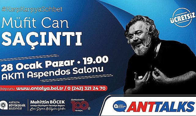 Antalya Büyükşehir Belediyesi tarafından düzenlenen Anttalks etkinliği kapsamında yönetmen, oyuncu ve senarist Müfit Can Saçıntı, 28 Ocak Pazar günü saat 19.00 ‘da AKM’de Antalyalılarla buluşacak. Antalya Büyükşehir Belediyesi’nin paylaşmaya değer fikirleri, yaşamları ve deneyimleri, başta gençler olmak üzere Antalyalılarla paylaşmak için geçtiğimiz yıl başlattığı Anttalks söyleşileri, ‘Karşı Karşıya Sohbet’ etkinliğiyle devam ediyor. ÜCRETSİZ KEYİFLİ SOHBET Anttalks: ‘Karşı Karşıya Sohbet’ etkinliğinin konuğu ‘Mandıra Filozofu’ filmleriyle dikkati çeken yönetmen, oyuncu ve senarist Müfit Can Saçıntı olacak. Ünlü sanatçı Saçıntı’nın, karşı karşıya sohbetle deneyimlerini katılımcılarla paylaşacağı etkinlik ücretsiz olarak 28 Ocak Pazar günü saat 19.00’da Atatürk Kültür Merkezi’nde gerçekleşecek. Antalya Büyükşehir Belediye Başkanı Muhittin Böcek, etkinliğe tüm Antalyalıları davet etti.Kaynak: (BYZHA) Beyaz Haber Ajansı