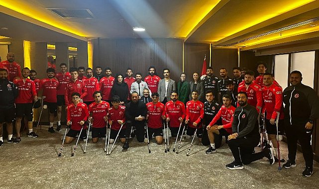 Almanya'da faaliyet gösteren Altın Adımlar Derneği (Goldene Schritte e.V.) başkanı Serkan Solmaz, Yalova'da bir otel tesisinde kamp yapan Ampute Futbol Milli Takımı'nı ziyaret etti.Yılmaz ADIYAMAN / YALOVA (İGFA) - Türkiye Ampute Futbol Milli Takımı, Fransa'da düzenlenecek olan Ampute Futbol 2024 Avrupa Şampiyonası 1-8 Haziran'da başlayacak. Türkiye Bedensel Engelliler Spor Federasyonu başkanı Alparslan Erkoç'un daveti üzerine Almanya'dan gelen Serkan Solmaz, Ampute Futbol Milli Takımı antrenörü İsmail Temiz ve milli takım futbolcuları ile tanıştı. Altın Adımlar Derneği başkanı Serkan Solmaz, "Ben de 2015 yılında kendim ampute oldum. 2019 yılından bu yana Türkiye'de ampute olacak vatandaşlarımızı tespit ediyoruz ve protez bacak ihtiyacı olanlara dernek olarak yardım ediyoruz. Bugün, burada Yalova'da kamp yapan Ampute Futbol Milli Takımını ziyaret ettim. Sporcuları birebir gördüm ve sohbet ettim. Benim için çok büyük bir onur oldu. Milli Takımımızı ve teknik kadromuza, Fransa'da başarılar diliyorum. Federasyon başkanımız Alparslan Erkoç'a da ayrıca teşekkür ediyorum. Fransa'da milli takımımızı yalnız bırakmayacağım, inşallah orada olacağım" dedi.
