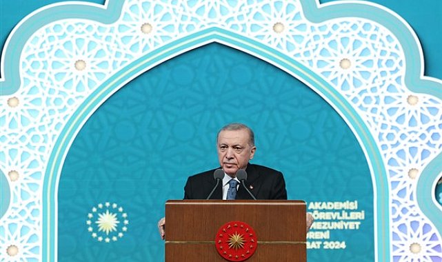 Erdoğan'ın konuşmasından bazı satır başları şöyle:"Külliyemizi teşrifleriniz dolayısıyla her birinize yürekten teşekkür edyorum. Milletin evine bu gazi mekana hepiniz hoşgeldiniz, sefalar getirdiniz. Diyanet Akademisi Başkanlığı 1'inci Dönem Aday Din Görevlileri Mezuniyeti vesilesiyle bir aradayız.Böylesine güzel bir atmosferde, böyle anlamlı bir program münasebetiyle gönüllerimizi kavuşturan rabbime hamdediyorum. Diyanet İşleri Başkanımıza ve Diyanet yönetimine de bu güzel buluşma için ayrıca teşekkür ediyorum.Bugün Diyanet teşkilatımızı ve din görevlilerimizin mesleki eğitimi adına gerçekten önemli bir merasim yapıyoruz. Aslında uzun yıllara sari bir emeğin ve projenin meyvesini almanın mutluluğunu hep birlikte yaşıyoruz. 8 aylık bir süreç ve 33 ayrı mekanda devam eden kurslar… Gerçekten bu bir azmin, bir kararlılığın ifadesidir.İlk olarak 2012 yılında hukuki altyapısını oluşturmaya başladığımız Diyanet Akademisi'nin 10 yılı bulan yoğun ve titiz çalışmaların ardından 2022 yılında hayata geçirdik.Akademinin kurulmasıyla birlikte Diyanet camiamız meslek öncesi eğitim ve mesleki eğitim noktasında son derece mücehhez bir yapıya kavuştu. Kuruluş sürecinde mevzuat alanındaki eksikler de giderildi.Müezzin, kayyım, imam hatip, kuran kursu öğreticisi ve vaiz olarak görev yapacaklar için 6 ay ile 3 yıl arasında meslek öncesi eğitim mecburiyeti getirildi.1976 yılından beri hizmet içi eğitim şartlarında 3 yıla kadar devam eden ihtisas ve kıraat eğitimleri, müstakil ve yasal bir çerçeveye oturuldu. Diyanet İşleri Başkanlığımızın merkez ve taşra teşkilatlarında yapılan her tür ve düzeydeki eğitimleri tek çatı altında topladık.Böylece verilen din hizmetlerinin niteliğini daha da artıracağız. Diyanet mensuplarımızın mesleki donanımını tahkim edecek, sadece kendi insanımıza değil, yurt dışında yaşayan vatandaşlarımıza ve kardeş halklara da çok daha iyi hizmet götürülmesini sağlayacak, Diyanetimizin kurumsal, beşeri ve ilmi kapasitesini her alanda ileriye taşıyacak kritik bir kurumu başkanlığımızın hizmetine sunmuş olduk.Biz de önce Başbakan ardından da Cumhurbaşkanı sıfatıyla ilk günden itibaren akademi ile ilgili tüm safahatı bizzat yakından takip ettik. Hamdolsun bugün de akademimizin ilk dönem kursiyerlerinin mezuniyetini görmenin bahtiyarlığı içerisindeyiz.Diyanet Akademisi Başkanlığı uhdesindeki 8 aylık eğitim süreçlerini başlarıyla tamamlayan 4537 aday din görevlimizi tebrik ediyorum.Akademide Kur'an-ı Kerim, tefsir, hadis, fıkıh gibi temel İslami ilimlerin yanı sıra dini musiki ve Kur'an kursu öğreticilik formasyonu dersleriyle kendilerini teçhiz eden kardeşlerimi gönülden tebrik ediyorum.Mezunlarımızın 3 bin 120'si imam hatip, 250'si müezzin kayyım, bin 167'si ise Kur'an kursu öğreticisi olarak görev yapacak. Bu kardeşlerimizin de görevlerine başlamasıyla birlikte Diyanet camiamız inşallah daha da güçlenecek.Mezunlarımızın her birine atanacakları yeni görev yerlerinde şimdiden rabbimden başarılar niyaz ediyorum. Mevla işlerini kolaylaştırsın, vazifelerini bereketli kılsın, ecirlerini ziyade eylesin.Aynı şekilde aday din görevlilerimizi en güzel şekilde yetiştiren saygıdeğer hocalarımıza da şahsım, milletim adına teşekkür ediyorum. Sizlerin şahsında yurt içinde ve yurt dışında özveriyle görev yapan bütün Diyanet mensuplarımıza, din görevlilerimize vazifelerinde kolaylıklar diliyorum.Biz, asırlar boyunca İlay-ı Kelimetullah’ın sancaktarlığını yapma şerefine nail olmuş bir milletin mensuplarıyız. Atalarımız, İslam’ı sadece kendi hayatlarına tatbik etmekle kalmamışlar, aynı zamanda yeni fetihlerle yayılmasına da hizmet etmişlerdir.Kur’an ve Sünnet’e sıkı sıkıya sarılan, İslam’da adeta kendini bulan ecdat; “Allah Allah” nidalarıyla huzuru, adaleti, emniyeti, güveni, barışı ve kardeşliği üç kıta, yedi iklime kadar ulaştırmıştır.Zaman zaman hadisle alay eden, hadisi küçüçmseyen bazı kendini bilmezleri hep görüyoruz, duyuyoruz ama biliyorum ki sizler bunlara zaten gereken dersi verecek ve hepimiz Kur'an'a, hadise sıkı sıkıya sarılmak suretiyle bugüne kadar İslam nasıl güçlü şekilde gelmişse bundan sonra da güçlü şekilde kıyamete dek gidecektir.Yaklaşık bin yıldır Türkler İslam’ı, İslam da Türkleri muhafaza etmiş; Türkler İslam’ın, İslam da Türklerin kılıcı olmuştur. Tarih kitaplarına şöyle bir göz attığınızda karşınıza çıkacak hakikat şudur: Türk demek, aynı zamanda Müslüman demektir.Üstat Necip Fazıl, bu gerçeği, çarpıcı bir dille bakınız nasıl ifade ediyor: "İçi alev alev Müslüman, dışı pırıl pırıl Türk ve içi dışına hâkim, dışı içine köle… Yeni Türk neslinin maya çanağı olmak ehliyeti hangi topluluktaysa ben oradayım. Allah'ın inâyeti ve resulünün ruhaniyeti bu yoldakilerin üzerinde olsun!."Dolayısıyla İslam’ı Türk’ten, Türk’ü de Din-i Mübin-i İslam’dan koparan, ayrıştıran, arasına sahte duvarlar ören anlayışın bu topraklarla hiçbir illiyeti yoktur.Son dönemde Türkiye karşıtı kimi çevreler tarafından aynı amaca hizmet eden çift kulvarlı bir kampanya yürütüldüğünü görüyoruz. Bunlardan ilki, lümpen faşistlerin gündeme getirmeye çalıştığı "İslamsız Türklük" tanımlarıdır.Milletimizin İslam’a ve Kur’an’a hizmetle geçen 1300 yıllık şanlı tarihi, bu şekilde yok sayılmaya çalışılıyor. Böylece milletimizi ayakta tutan, milletimize asli kimliğini kazandıran tarihi, kültürel ve beşeri değerleri tahrip edilmek isteniyor.Çok açık ve net söylüyorum. İslam'ın gaza ruhunu taşımayan bir Türklük tanımı ve projesi, aslında Türk milletini müzeye kaldırma, folklorik bir 