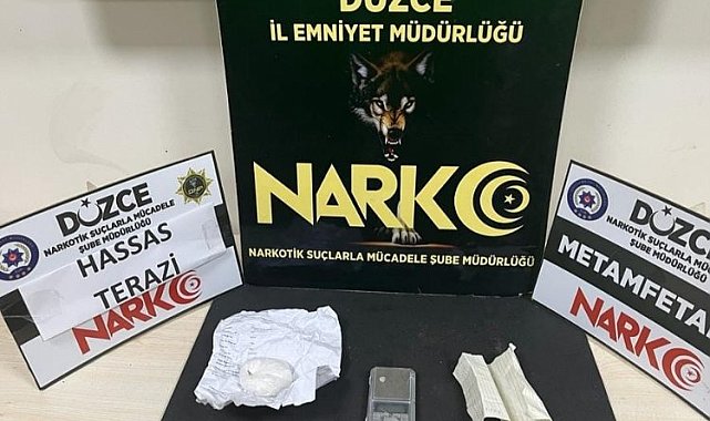 Düzce'de düzenlenen uyuşturucu operasyonunda araçta yapılan aramada bir miktar uyuşturucu madde ve hassas terazi ile yakalan iki şahıs adli makamlarca tutuklandı.Sefer DEMİR / DÜZCE (İGFA) - Düzce Cumhuriyet Savcılığı'nın talimatıyla Narkotik Suçlarla Mücadele Şube Müdürlüğü ekipleri tarafından Anadolu Otoyolunda operasyon düzenlendi.Operasyonda S.A ve O. Y adlı şahısların bulunduğu araçta yapılan aramada 2 parça halinde toplam 70 gram Metanfetamin maddesi ve 1 Adet çalışır vaziyette hassas terazi ele geçirildi.Şüpheliler Cumhuriyet Başsavcılığı tarafından sevk edildiği nöbetçi sulh ceza mahkemesi tarafından tutuklandı.