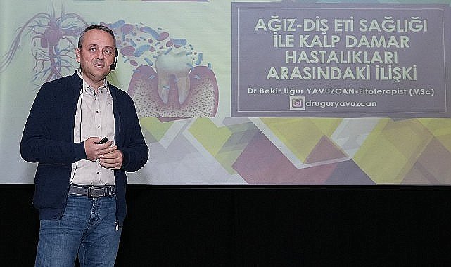 “Diş eti, ağız sağlığı ve kardiyovasküler hastalıklar arasındaki ilişki” başlığında sunum yapan Dr. Bekir Uğur Yavuzcan, “Diş etlerini enfekte ederek diş eti iltihabına ve periodontite neden olan bakteriler, aynı zamanda vücudun başka yerlerindeki kan damarlarına da giderek kan damarı iltihabına ve hasarına neden olurlar. Küçük kan pıhtıları, kalp krizi ve felç durumu bunu takip edebilir. Ağız boşluğunda yaklaşık 800 bakteri türü tespit edilmiştir ve periodontal hastalık toplumda en sık görülen ağız hastalığıdır. Kulağa garip gelse de, dişlerinizi düzenli olarak fırçalamak ve diş ipi kullanmak, gelecekteki bir kalp krizi ile aranızda duran şey olabilir. Araştırmalar, bazı Streptococcus cinsi bakterileri kalp arterlerinde yağlı plak birikimiyle ilişkilendirmiştir. Ağız için sağlıklı olan, vücudun geri kalanı için de sağlıklıdır ve bunun tersi de geçerlidir. Sonuç olarak; bağlantı ister doğrudan ister dolaylı ister tesadüfi olsun, sağlıklı bir ağız ve onu bu şekilde tutmaya yönelik bir rejim dişlerinizi ve organlarınızı korumanıza yardımcı olabilir. Önlem almak için şekeri ve basit karbonhidrat alımını acilen durdurun, tuzlu su ile ağız çalkalama, çay ağacı yağı veya kekik yağı, kekik suyu ürünleriyle ağzınızı çalkalayın” diye konuştu.