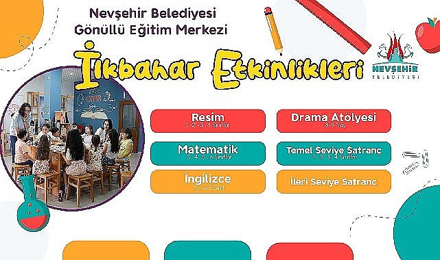 Nevşehir Belediyesi Gençlik ve Spor Hizmetleri Müdürlüğü bünyesinde faaliyet gösteren Gönüllü Eğitim Merkezi’nde İlkbahar Etkinlik Dönemi başlıyor.Nevşehir Belediyesi Gönüllü Eğitim Merkezi’nde ilköğretim 1, 2, 3, 4, 5 ve 6. sınıf öğrencilerinin okul derslerine destek olmak ve sosyal yönden kendilerini geliştirmeleri için Matematik, Resim, İngilizce, Drama Atölyesi, Temel Seviye ve İleri Seviye Satranç Kursları açılacak. 10 Şubat 2024 tarihinde başlayacak olan kurslar için başvurular 05 Şubat 2024 tarihinde sona erecek. Sınırlı kontenjanlarla açılacak olan ücretsiz kurslar 20-21 Nisan 2024 tarihinde tamamlanacak.Kayıt yaptırmak isteyen öğrenciler, Nevşehir Belediyesi Gençlik ve Spor Hizmetleri Müdürlüğüne şahsen başvurabilecekleri gibi 05 Şubat 2024 tarihine kadar nevsehir.bel.tr adresindeki hızlı menü içerisinde bulunan Gençlik ve Spor Hizmetleri Müdürlüğü Kurs Başvuruları sekmesinden Gönüllü Eğitim Merkezi bölümünü seçerek online olarak kayıt yaptırabilir.Nevşehir Belediyesi Gönüllü Eğitim Merkezi faaliyetleri ve kurslar hakkında bilgi almak isteyen veliler, merkezin 0384 213 86 93 nolu telefon hattını arayabilir.KURSLAR - KONTENJANResim 1. Sınıf - 20 KONTENJANResim 2. Sınıf - 20 KONTENJANResim 3. Sınıf - 20 KONTENJANResim 4. Sınıf - 20 KONTENJANTemel Seviye Satranç (1,2,3,4 Sınıf) - 40 KONTENJANMatematik 3. Sınıf - 25 KONTENJANMatematik 4. Sınıf - 40 KONTENJANMatematik 5. Sınıf - 30 KONTENJANMatematik 6. Sınıf - 40 KONTENJANİngilizce 3. Sınıf - 25 KONTENJANİngilizce 5. Sınıf - 25 KONTENJANDrama Atölyesi 8-9 Yaş - 25 KONTENJANİleri Seviye Satranç - 25 KONTENJAN Kaynak: (BYZHA) Beyaz Haber Ajansı