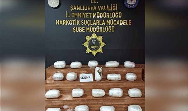 Şanlıurfa Narkotik Suçlarla Mücadele Şube Müdürlüğü ekiplerinin son operasyonunda 20 kilogram Skunk maddesi ele geçirildi.Olayla ilgili bir kişi gözaltına alınırken, Şanlıurfa Valisi Hasan Şıldak çalışmalarından dolayı tüm güvenlik güçlerini tebrik etti.Vali Şıldak, mücadelede vatandaş duyarlılığına dikkat çekerek "Uyuşturucu satışını daha etkili şekilde önleyebilmemiz için her duyarlı vatandaşımızın 112 hattına veya Uyuma Programına ihbarda bulunmasını istiyorum. Bu büyük sorunu Şanlıurfa’da hep birlikte ortadan kaldıralım" ifadelerini kullandı.