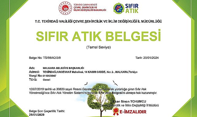 Malkara Belediyesi, “Sıfır Atık Projesi” kapsamında hayata geçirdiği Sıfır Atık Yönetim Sistemi ile Çevre, Şehircilik ve İklim Değişikliği Bakanlığı Tekirdağ İl Müdürlüğü tarafından Sıfır Atık Belgesi almaya hak kazandı.