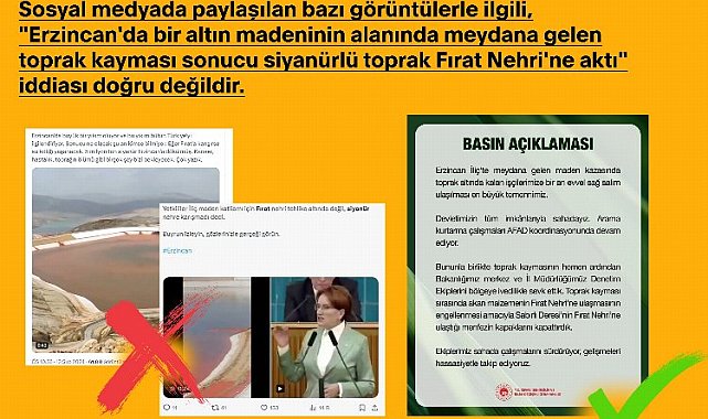 İletişim Başkanlığı, sosyal medyada paylaşılan bazı görüntülerle ilgili, "Erzincan'da bir altın madeninin alanında meydana gelen toprak kayması sonucu siyanürlü toprak Fırat Nehri'ne aktı" iddialarının dezenformasyondan ibaret olduğunu kaydetti.ANKARA (İGFA) - Erzincan'da maden ocağındaki toprak kaymasına yönelik çeşitli iddialarla ilişkin açıklama İletişim Başkanlığı bünyesindeki Dezenformasyonla Mücadele Merkezi'nden geldi.Sosyal medyada paylaşılan iddiaya ilişkin konu görüntülerin Fırat Nehri ya da herhangi bir baraja değil, Erzincan'ın İliç ilçesinde bulunan altın madeninin atık havuzuna ait olduğunu kaydeden İletişim Başkanlığı, paylaşımında, "Ayrıca toprak kaymasının hemen ardından Çevre, Şehircilik ve İklim Değişikliği Bakanlığı merkez ve İl Müdürlüğü Denetim Ekipleri bölgeye sevk edilerek toprak kayması sırasında kayan toprağın Fırat Nehri'ne ulaşmasının engellenmesi amacıyla Sabırlı Deresi'nin Fırat Nehri'ne ulaştığı menfezin kapakları kapattırılmıştır. Nehre herhangi bir malzemenin ulaşması veya karışması söz konusu değildir. Bölgede meydana gelen toprak kaymasının, maden alanındaki atık havuzu ile herhangi bir ilgisi bulunmamaktadır" ifadelerini kullandı.Bu arada İletişim Başkanı Fahrettin Altun ise altın madeninin bulunduğu geniş bir alanda meydana gelen toprak kaymasından etkilenen madencilerin sağ salim kurtarılması için tüm kurum ve kuruluşların tam koordinasyon hâlinde çalışmalarını sürdürdüğünü kaydetti. Madencilerin kurtarılması ve bu elim olayın aydınlatılması için yapılan çalışmalarının Cumhurbaşkanı Erdoğan tarafından yakından takip edildiğini de kaydeden Altun, "Hadise bütün boyutlarıyla soruşturulmaktadır. Madenci kardeşlerimizin sağ salim kurtarılmasını diliyoruz. Vatandaşlarımızın resmî kanallar yoluyla teyit edilmemiş ve doğruluğundan emin olunmayan sosyal medya içeriklerine itibar etmemesi, doğru bilgi için resmî kanalları takip etmesi önem arz etmektedir. Allah ülkemizi tüm kazalardan muhafaza eylesin. Geçmiş olsun" dedi.