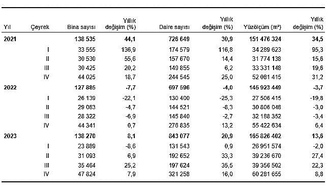 Belediyeler tarafından 2023 yılı IV. çeyreğinde yapı kullanma izin belgesi verilen yapıların toplam yüzölçümü 37,2 milyon m² iken; bunun 21,0 milyon m²'si konut, 8,5 milyon m²'si konut dışı ve 7,7 milyon m²'si ise ortak kullanım alanı olarak gerçekleşti.En yüksek yüzölçüm payı %72,1 ile iki ve daha fazla daireli binaların oldu
