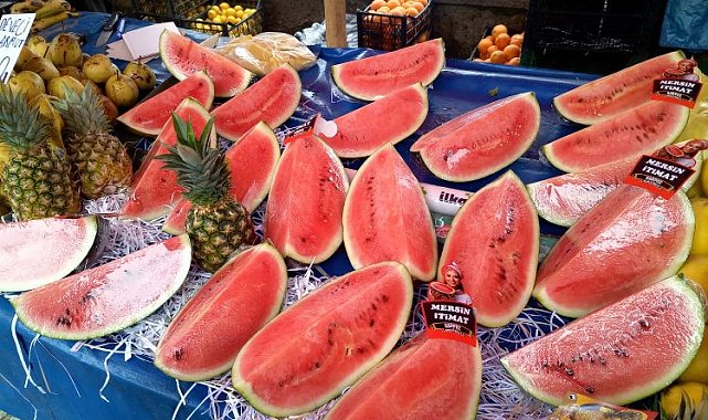 Yaz mevsiminin vazgeçilmez meyvesi karpuz tezgahlara dilim olarak indi!Pazaryeri Gündem / BİLECİK (İGFA) - Bilecik'in Pazaryeri ilçesinde kurulan halk pazarında yaz aylarının vazgeçilmez meyvesi karpuz tezgahlara dilim olarak indi.Bilecik merkezden Pazaryeri ilçe pazarına meyve satmaya gelen pazarcı Oğuzhan Yıldırım'ın tezgahını süsleyen karpuz dilimleri kilosu 60 liradan müşteriye sunuldu.